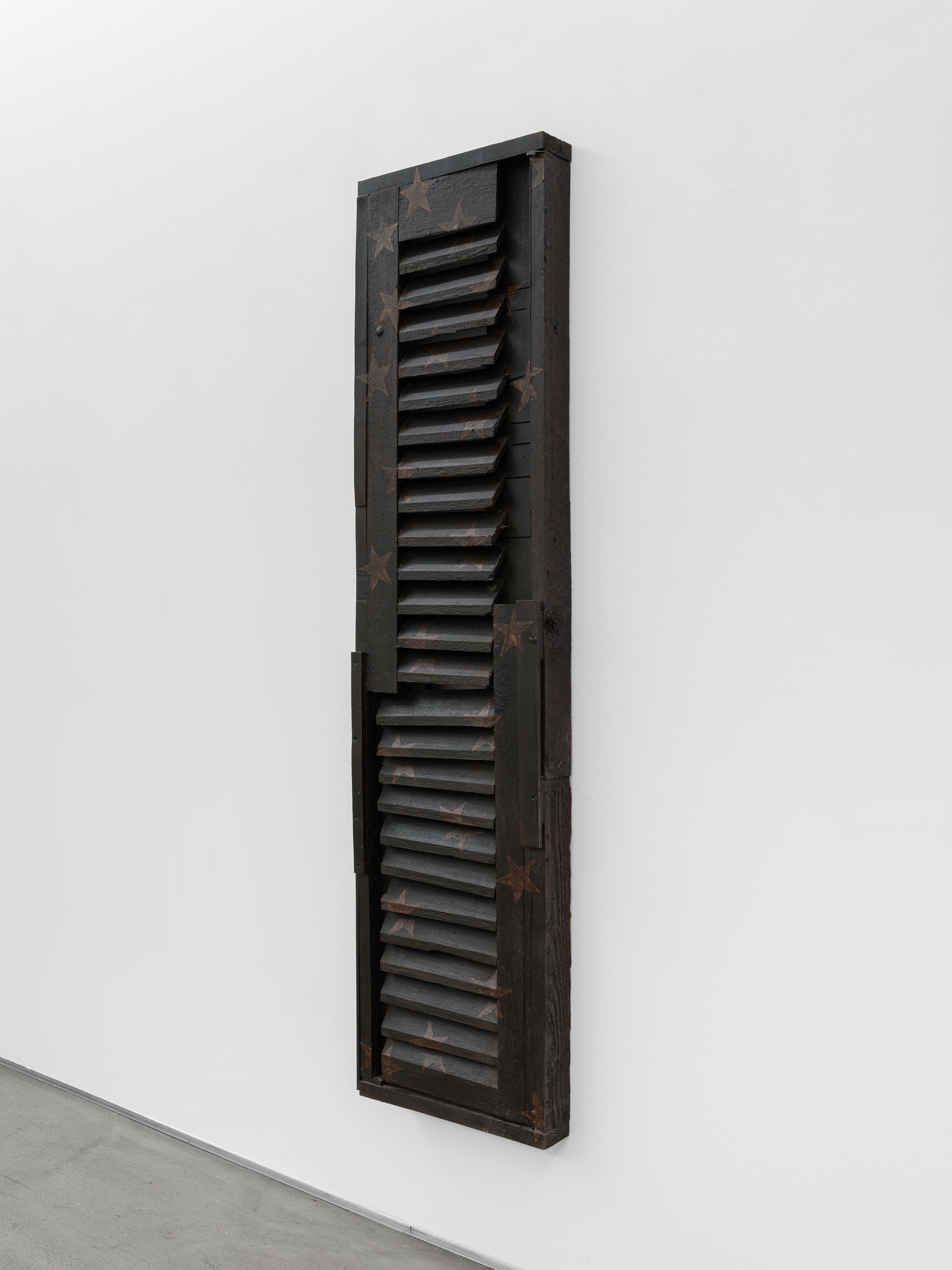 Cinematic scenography, to quote a film by old Fritz Lang, has something to do with a “secret behind the door,” which makes us fantasize treasures or tombs behind every inaccessible façade. David Lynch’s cinema excels in such enclosed spaces—lodges or blue boxes—that are so many Pandora’s boxes for desire. Here, the fragments of reassembled furniture (shutter, grille, mailbox), with their closed blinds like modest eyelids, seem to veil a secret we try to decipher on their surfaces covered with brown or black waxed strips, the lingering trace of grime, dust, or fire on which faded stars sometimes delicately appear.
