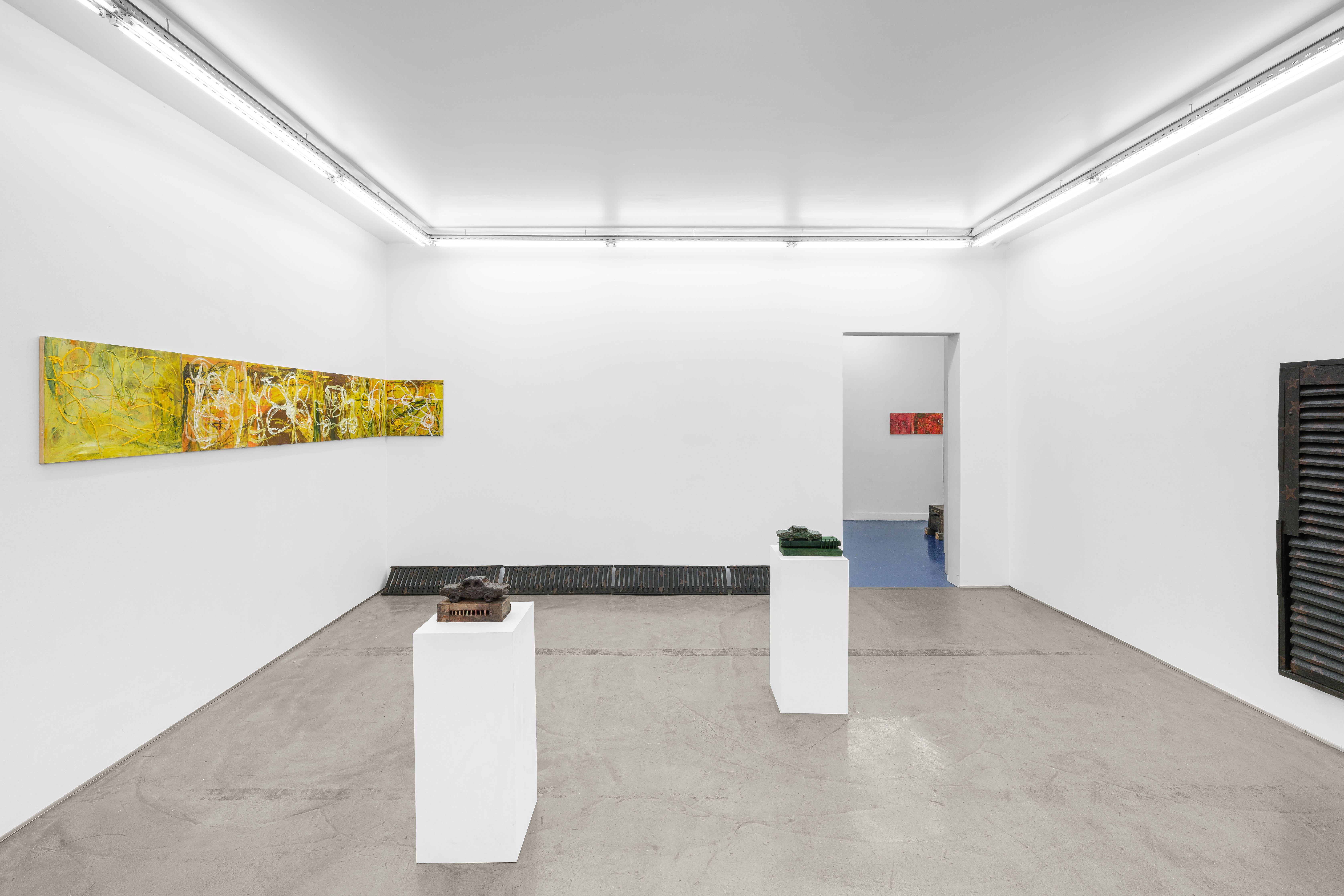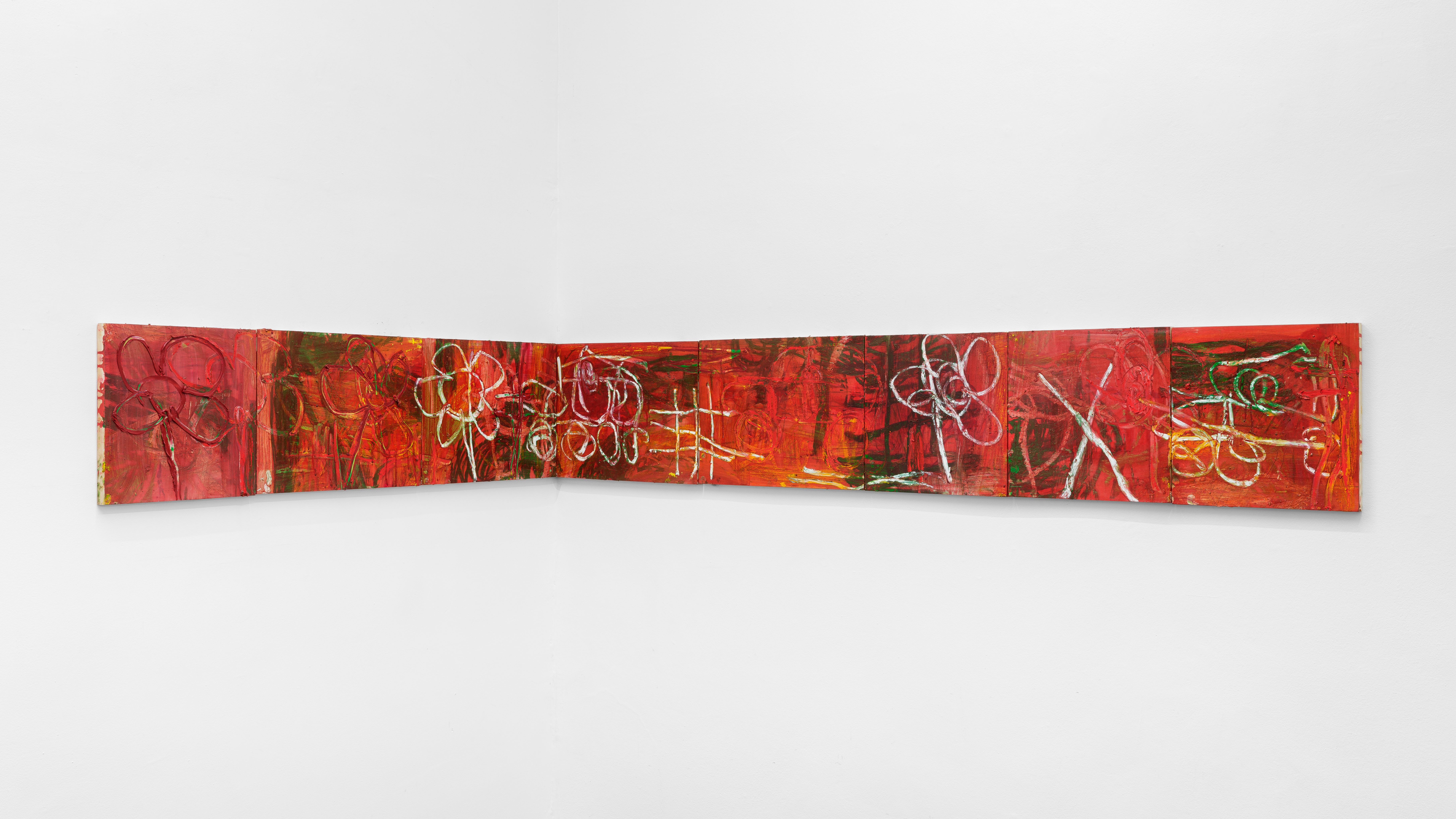 At first glance, nothing connects these pieces to Julian Farade’s paintings with their vivid, blazing symbols, except perhaps a certain frieze-like spread. One must come closer and examine the panels to notice that the uniformity of the surface is broken and connected, that figures are transferred from one to another like snapshots taken at different instants. Look at each panel again, let the image slowly develop, and you will give relief to the figures, you will see them layered into different superimposed strata. Horizontal unfolding of time, unfolding of time in depth: every image takes its time to mature, for the one who made it as much as for those who will look at it. In short: give the image duration and depth, and you will turn it into a film shot.